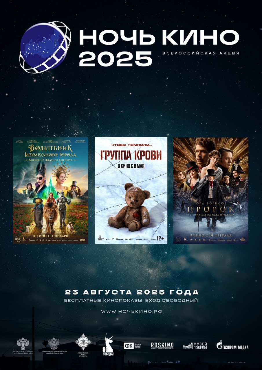 В кинозале «Жуков» кинотеатра «Поклонка» пройдет показ фильма открытия «Ночи кино» – военной драмы «Группа крови» (2025, реж. Максим Бриус). Еще два фильма – семейное фэнтези «Волшебник Изумрудного города. Дорога из желтого кирпича» (2024, реж. Игорь Волошин) и музыкальный байопик «Пророк. История Александра Пушкина» (2024, реж. Феликс Умаров) – зрители увидят в залах «Рокоссовский» и «Василевский».